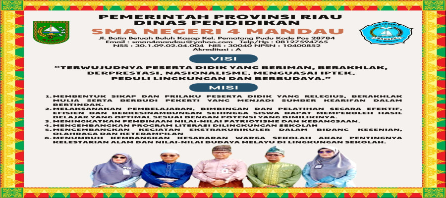 Selamat menjalankan Ujian Sumatif Akhir Jenjang untuk seluruh siswa/siswi kelas XII SMAN 4 Mandau. Semoga senantiasa diberi kesehatan, kemudahan serta kelancaran dal